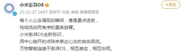 12月27日,小米官方公布了澎湃OS的全新标识:每个人心念涌现的瞬间,像是星点迸发,构成流动而有序的星系旋臂;用中心旋开的点阵来表达心念的自由奔流;寓意万物智能连接于澎湃OS,相互感应,相互协同。小米澎湃OS官方微博还称,要让全球每个人都能享受科技带来的美好生活,让每个心意都能自由奔流。