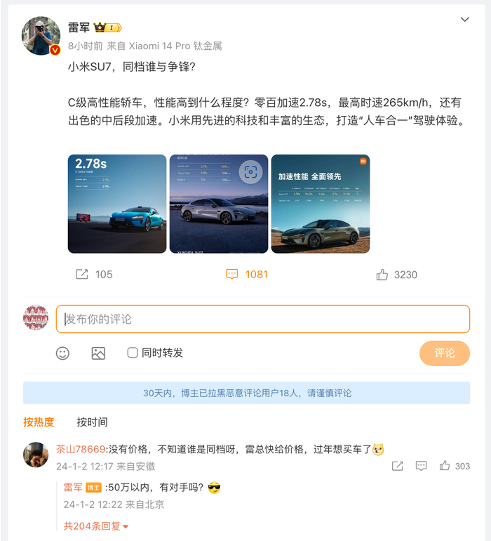 在转发辟谣小米汽车供应链的微博下面,雷军与网友互动时表示:“50万以内,有对手吗?”结合此前技术发布会上,雷军表示小米汽车定价不会低于14.99元,可知小米汽车定价落在了15万元-50万元的区间之内。
