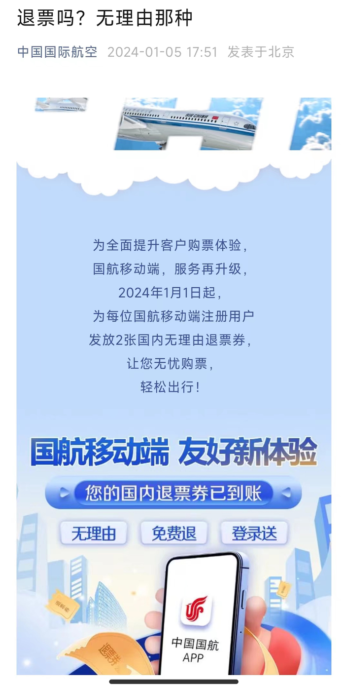除了南航、东航,中国国际航空也在此前2023年10月29日调整国内客票退改手续费,主要降低了经济舱的退改手续费。而最新于1月5日下午,国航在公众号发布消息称,为全面提升客户购票体验,国航于2024年1月1日起,为每位国航注册用户发放2张国内无理由退票券,有效日期将至今年12月31日。