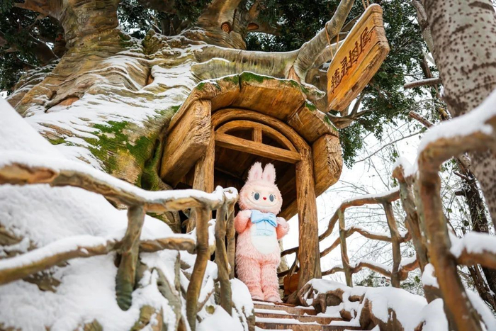 走进奇遇森林就像走进LABUBU真实生活的部落。在各种生活娱乐场景之中,半人高的LABUBU成群结队,以各种姿态出没于公园的参天大树之间。