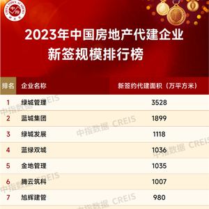 中指院发布的《2023年代建销售规模排行榜》显示,绿城管理以1068亿元合约销售金额位列代建销售榜首位,遥遥领先。中原建业和蓝绿双城代建项目销售金额分别为295亿元和202亿元,位列二、三位。