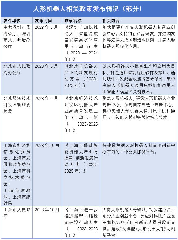 (记者根据公开资料整理)北京市各部门在相关的产业政策中对人形机器人有较多着墨。2023年6月,《北京市机器人产业创新发展行动方案(2023-2025年)》明确提出加紧布局人形机器人——以人形机器人小批量生产和应用为目标,打造通用智能底层软件及接口、通用硬件开发配套设施等基础条件,集中突破人形机器人通用原型机和通用人工智能大模型等关键技术。8月,北京经开区发布《北京经济技术开发区机器人产业高质量发展三年行动计划(2023-2025年)》,提出聚焦人形机器人,建设人形机器人产业创新中心,争创国家制造业创新中心,集中突破人形机器人通用原型机和通用人工智能大模型等关键核心技术。再看上海,2023年10月,上海印发的《上海市促进智能机器人产业高质量 创新发展行动方案(2023-2025年)》指出:到2025年,打造具有全球影响力的机器人产业创新高地……将建设包括人形机器人制造业创新中心在内的三个公共服务平台。同月印发的《上海市进一步推进新型基础设施建设行动方案(2023-2026年)》提到,面向人形机器人等领域,初步建成若干前沿产业创新平台,为应对科技产业变革和探索科学研究新范式提供设施支撑……建设“大模型+人形机器人”协同创新平台。上海临港新城产业区(临港集团)也表示,将建设上海首个全球人形机器人核心创新节点的人形机器人创新孵化器。产业基础各具特色人形机器人是机器人产业皇冠上的明珠,人形机器人产业发展与机器人产业基础扎实与否关系密切,必须站在机器人这个“巨人”的肩膀上。“人形机器人的发展离不开强大的机器人产业基础,包括产业链完备度、人才、产学研基础、应用配套等。”高工机器人产业研究所所长卢翰宸在接受《中国电子报》记者采访时表示。北京和上海两个城市的机器人产业规模领跑全国——两城市2022年机器人产值均已突破100亿元。官方数据显示,近3年,北京机器人产业收入年平均增速超过20%,2022年机器人产业收入突破了170亿元。上海浦东机器人企业超过100家,机器人核心企业产值已达100多亿元。此外,上海的重点产业机器人密度达383台/万人,达到国际一流水平。深圳市目前尚未官方披露机器人相关产值信息。此外,企业数量和质量是衡量区域内机器人产业发展水平的重要指标。中国电子学会副理事长兼秘书长陈英表示,从我国机器人领域国家级专精特新“小巨人”企业和上市企业分布来看,我国机器人领域优质企业重点分布在京津冀、长三角、珠三角地区,形成了以北京、上海、深圳等为代表的产业集群。北京、上海和深圳目前均已形成一定规模的机器人产业集群,三地的机器人发展各具特色。北京人形机器人创新中心是北京市经开区正在打造的“人形机器人产学研用一体化创新综合体”。1月12日成立的北京人形机器人创新中心专委会汇聚了全国顶级专家资源——专委会主任由全国首批20个全国重点实验室之一的多模态人工智能系统全国重点实验室主任、中国科学院院士乔红担任,副主任包括了国际著名人工智能专家北京通用人工智能研究院院长朱松纯、北京智源人工智能研究院理事长黄铁军等。“专家委员会将聚焦于提升人形机器人产业发展的共性和关键核心技术,统筹科技创新与产业化应用,把关技术发展路线、揭榜挂帅和产业孵化项目,确保创新中心持续稳步提升创新能力,实现科学有效的整机带动、软硬协同和生态构建,推动创新中心人形机器人技术和产业高质量发展,为北京人形机器人产业的发展壮大贡献力量。”乔红表示。致力于打造世界级人工智能产业集群的上海,AI大模型产业蓬勃发展,为人形机器人的“大脑”发展提供基础。徐汇区是上海市大模型产业生态集聚区,该区不仅吸引了大模型语料数据联盟、大模型测试验证与协同创新中心、上海大模型合规指导服务中心等功能平台落地;还吸引近200家上下游企业落户,首批通过《生成式人工智能服务管理暂行办法》备案的8家国内大模型机构企业中,徐汇区独揽3家。背靠粤港澳大湾区的深圳市,关键器件资源十分丰富。人形机器人产业链中,减速器、伺服电机、线性执行器、滚柱丝杠是价值量较大的核心部件。专注视觉感知的龙头企业奥比中光、专注滚珠/滚珠丝杠的供应商汇川技术以及专注谐波减速器、无框力矩电机的昊志机电都是“粤字号”企业,为深圳市发力人形机器人产业提供支撑。2024是量产关键年2022年,特斯拉正式发布人形机器人“擎天柱”,人形机器人开始受到金融界和产业界的极大关注,国内企业快速跟进。Cyber One(铁大)、远征A1、GR1、先行者K1/S1/D1、XR4……据粗略统计,在2023一年间,小米、科大讯飞、追觅等国内公司相继发布十余款人形机器人产品。