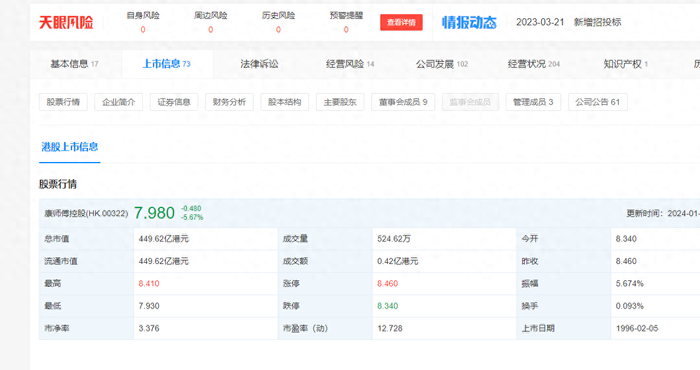 从2022年的315开始,康师傅就被中断了股价上升趋势,并开启了跌跌不休之路。直到2024年的1月15日收盘,天眼查APP显示,康师傅已跌落至8.46元/股,股价创2020年以来的历史新低……
