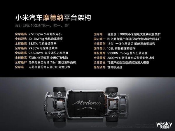 比如高效双模热泵 空调 技术,摆脱冬季能耗高、续航虚的体验痛点;比如小米自研泰坦合金材料和9100吨一体式大压铸;比如全球最高的2000MPa超高强度热成型钢,90.1%高强度钢和 铝 合金占比,整车扭转刚度高达51000N·m/deg,行业第一安全等等。