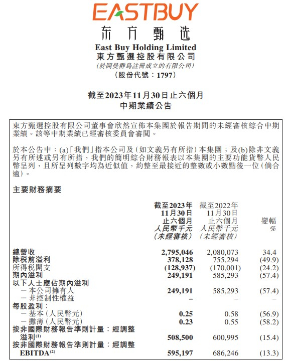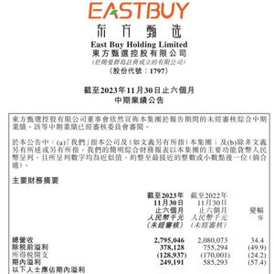 1月24日,东方甄选发布2024财年中期业绩,发布2024财年中期业绩,2023年6月1日-11月30日,公司共实现总营收27.95亿元,同比增长34.4%;实现净利润2.49亿元,同比下滑57.4%。针对“增收不增利”的情况,东方甄选表示,这主要由于公司的业务大幅增长,导致自营产品的存货成本及运输成本增加所致。