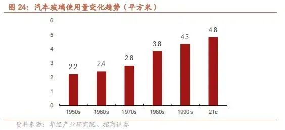 相关研报显示,20世纪50年代,单车玻璃用量只有平均2.2平方米。如今,单车玻璃平均用量已经提升至4.5-5平方米。浙商证券研报认为,在汽车智能化发展以及消费者对驾乘体验的追求下,单车玻璃面积还将持续增加。