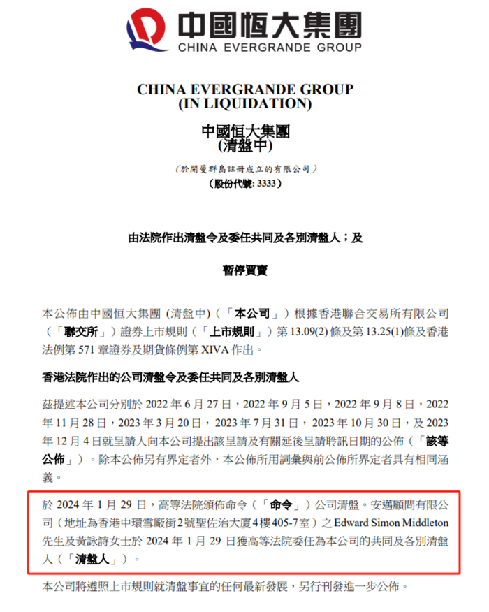 1月29日,中国恒大公告,香港高等法院已经颁布命令中国恒大清盘。