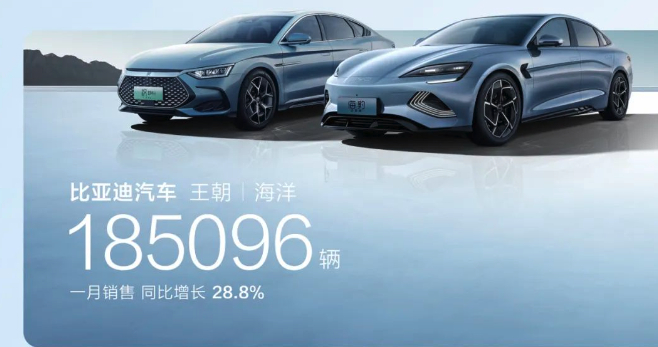 细分来看,比亚迪王朝、海洋系列仍是销售主力,1 月销量为 185096 辆,占比亚迪 1 月乘用车销量的 91.86%。比亚迪王朝、海洋系列销量同比增长 28.8%。