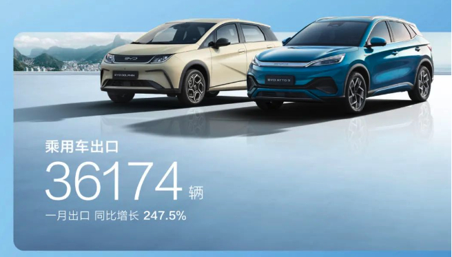 1 月,比亚迪乘用车出口 36174 辆,同比增长 247.5%。目前的比亚迪出口的新能源车型已经覆盖全球六大洲的 70 多个国家和地区,超 400 个城市。比亚迪的新能源技术和车型也在国际上获得多项奖项。比亚迪表示,未来还会有更多车型走向海外,持续为中国汽车出海贡献力量。