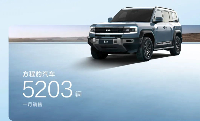 方程豹品牌 1 月销售 5203 辆。方程豹汽车首款车型豹 5 于 2023 年 11 月 9 日上市,新车共推出三个版本,售价区间为 28.98 万元 - 35.28 万元。豹 5 是方程豹汽车首个搭载 DMO 超级混动越野平台的量产车型。DMO 平台定位全能,兼顾越野性能、城市体验、可拓展性等各个维度。