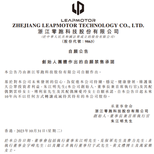10月31日,零跑汽车在港交所发布公告,基于对公司未来发展的信心,为促进公司持续、稳定、健康发展,维护广大公众投资者利益,朱江明先生(公司创始人、董事长兼首席执行官)及其配偶刘云珍女士、傅利泉先生及其配偶陈爱玲女士自愿承诺,自本公告日起未来10年内不以任何方式转让或减持其持有的公司股份。