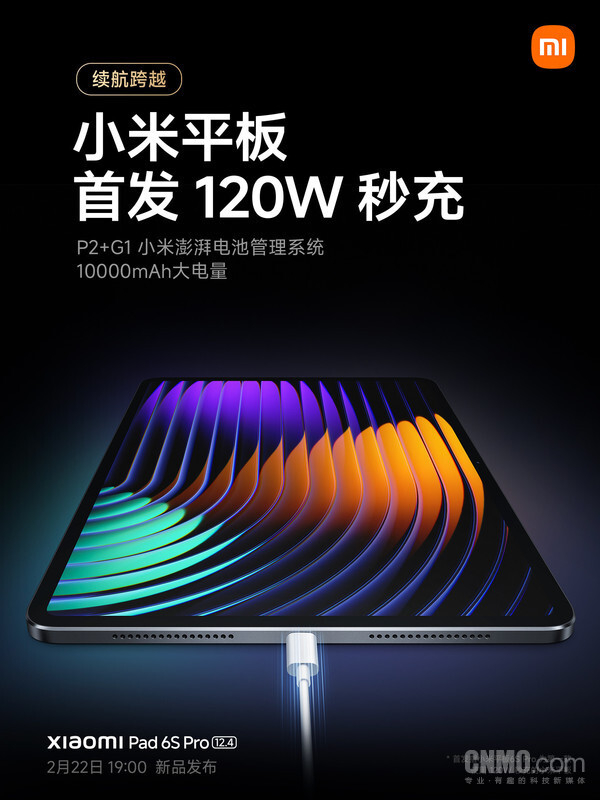 【CNMO新闻】2月19日,小米正式官宣了小米平板6S Pro,定档2月22日晚7点发布。随着发布时间的临近,官方也公布了更多关于平板的信息。续航方面,小米官方宣布,小米平板6S Pro配备了10000mAh大电池,深度休眠模式下待机最长可达43.6天!此外,该平板还将首发120W秒充,35分钟即可将电量充至100%。