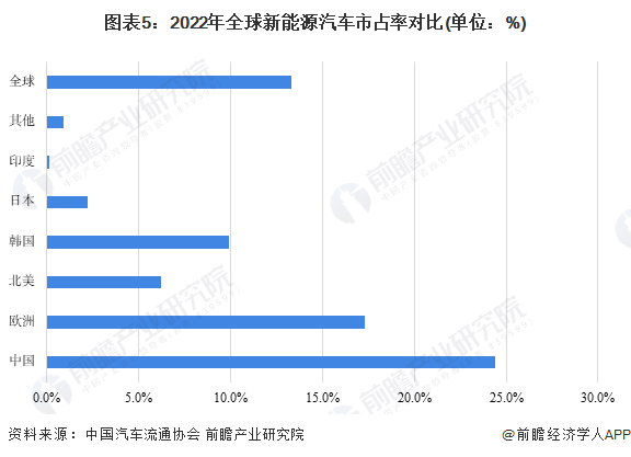 从市占率来看,2022年全球新能源汽车市占率达13.3%,其中,中国新能源汽车市占率最高,2022年达到24.4%,其次为欧洲,新能源汽车市占率为17.3%。相比全球新能源汽车市占率13.3%的平均水平,可以看到新能源汽车在印度、日本的市占率均较低,未来市场空间相对广阔。