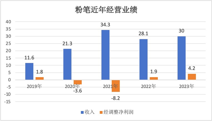 体现业绩健康程度更重要的指标是利润。2021年虽然收入创粉笔历史峰值,但经调整净亏损同样高企,达8.22亿元。2023年经调整净利润则不少于4.2亿元,不仅与2021年相比从巨亏到大幅盈利,与2022年相比也增长一倍有余。