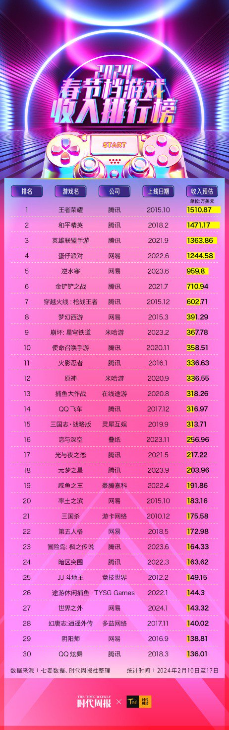 除《王者荣耀》《和平精英》《英雄联盟手游》之外,腾讯还有《元梦之星》《金铲铲之战》《穿越火线:枪战王者》等共计13款游戏进入收入30强榜单,占比高达43%;合计收入达7556.78万美元,占30强游戏春节档合计预估收入的57.31%。