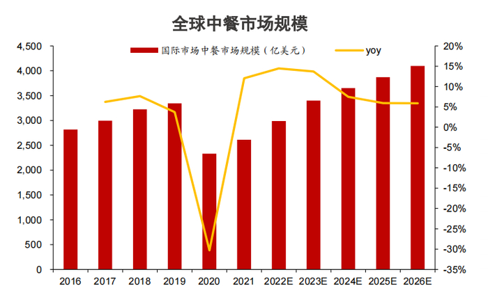 遍布世界各地的6000万海外华人是中餐出海重要根基。不仅如此,中餐在全球的影响力不可小觑,谷歌数据显示,中餐在全球范围内搜索热度极高,远超日料、韩料、墨西哥餐。2021年,火锅以289亿美元的市场规模(市占率11%)位居海外中餐第一细分赛道。根据沙利文报告预计,2021-2026年,CAGR将达到10%,领跑海外行业均值(9.6%)。