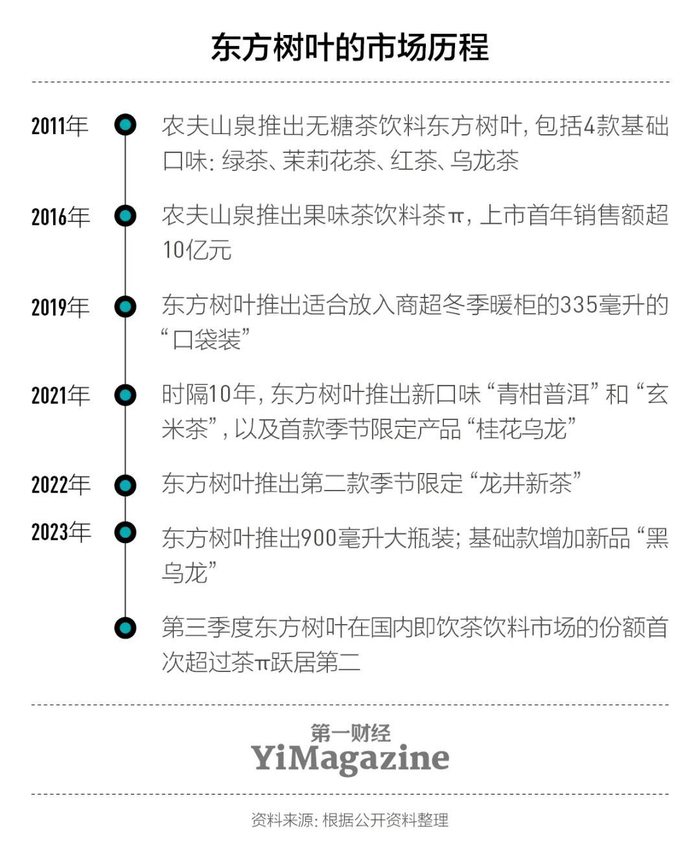 说到原因,刘峰认为是东方树叶的上市遇到了一个“更好的时代”:2011年,农夫山泉的包装饮用水超过康师傅成为行业第一,正在冲刺百亿元的年销售额目标。