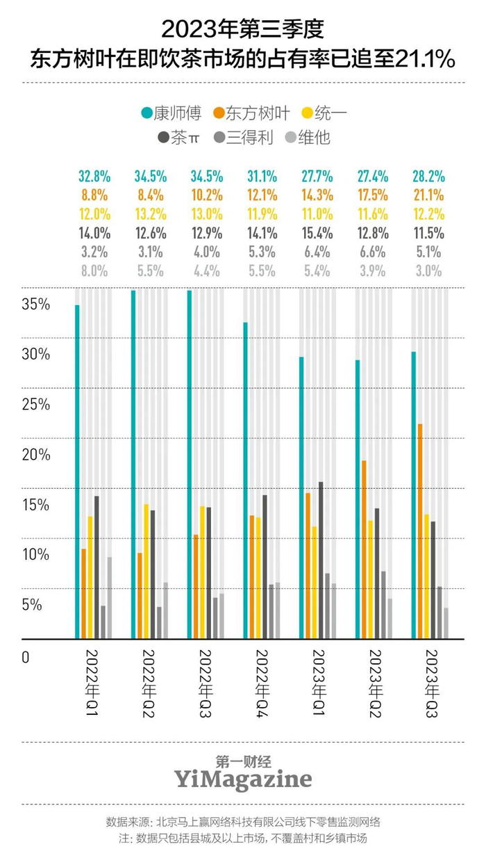 第三方市场研究机构码上赢对国内县城及以上市场的线下零售网络的监测数据显示,东方树叶这一轮市场份额的加速提升始于2022年下半年,从市占率8.4%、行业排名第四的位置,先是在当年第四季度超越“统一”旗下的产品,后又在2023年第二季度反超了农夫山泉另一款果味茶饮料“茶π”,至监测截止的第三季度,东方树叶与市场第一名康师傅之间的差距,从前一年的24个百分点收窄至7个百分点。东方树叶也是国内市场份额最大的无糖茶,而这个细分领域的第二名目前是日本的三得利,根据码上赢的监测数据,它在中国整体即饮茶市场的占有率至今未及7%。