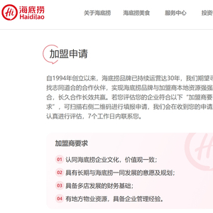 新消费日报观察到,目前在海底捞官网已上线加盟申请入口,但具体加盟申请条件较为简略。海底捞官网加盟要求显示,加盟商应当认同海底捞企业文化、具有长期与品牌一同发展的意愿及规划、具备多店发展的财务基础,以及有地方物业资源、具备企业管理经验。