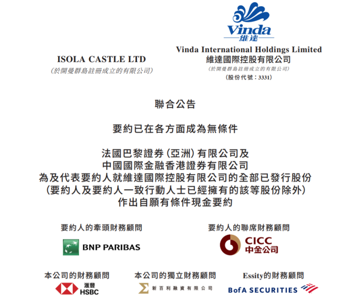 直至12月15日,维达国际发布公告称,要约人Isola Castle Ltd提出以每股23.50港元的价格收购维达国际全部股份。股权交易完成后,Isola Castle Ltd将持有维达约72.62%的股份,而Essity将不再持有维达的任何股份。