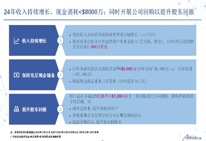 反观和誉医药,在降本增效策略的有效执行下,公司预计2024年现金消耗将小于8000万美元。而在收入层面,由于今年第一季度,来自默克的7000万美元首付款已到账,加上稳健现金储备下,公司今年利息收入及政府补助预计持平或小幅增长,叠加研发进度带来的管线里程碑收入以及潜在的BD收入,和誉有望在2024年实现现金流收支平衡。
