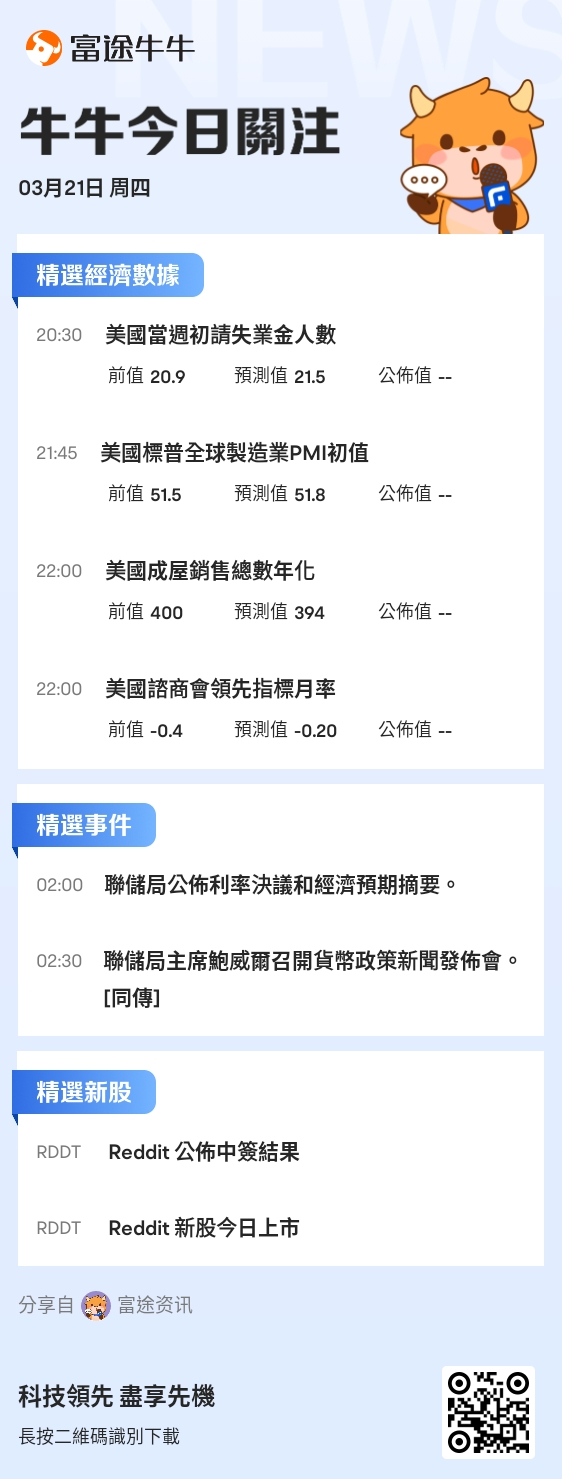 重磅新股方面,“美国版贴吧”$Reddit (RDDT.US)$将于今日在纽交所上市。