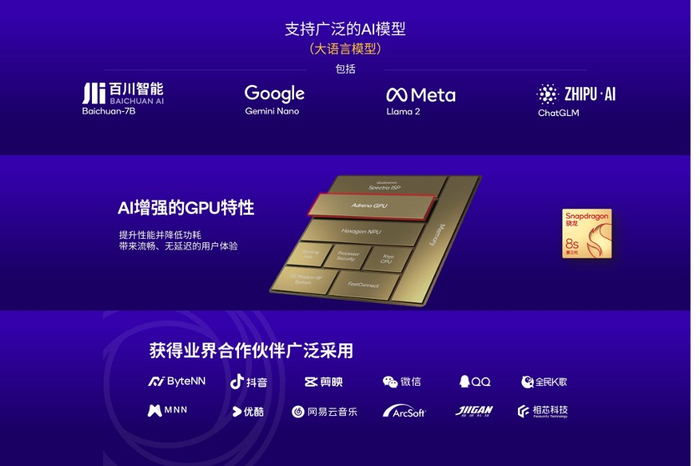 从参数支持能力来看,第三代骁龙8s可以支持高达100亿参数级别的大语言模型。该平台还支持更为广泛的AI大模型,其中包括Baichuan-7B,Google Gemini Nano、Llama2和ChatGLM等等。