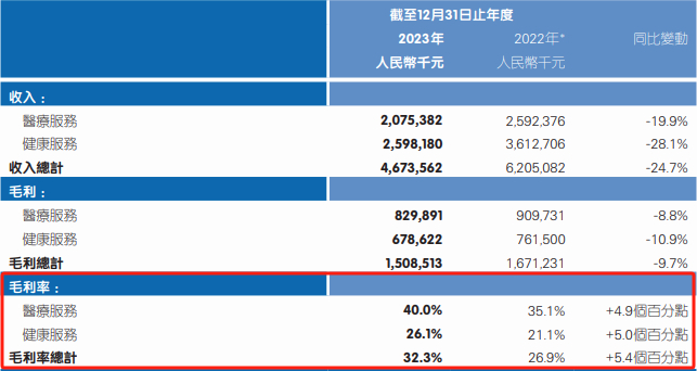 具体来看,医疗服务业务收入20.75亿元,同比减少19.9%;健康服务业务收入25.98亿元,同比减少28.1%。不过,两大业务板块毛利率均提升了约5个百分点,医疗服务业务的毛利率提高至40%,健康服务业务毛利率提高至26.1%。