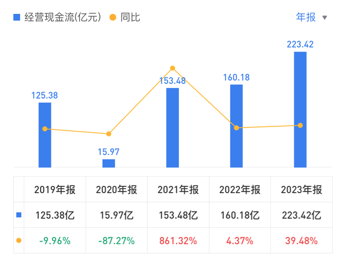 经营现金流方面,2020-2023年,吉利汽车的经营现金流分别为15.97亿元、153.48亿元、160.18亿元、223.42亿元,同比分别为-87.27%、861.32%、4.37%、39.48%。2023年,其经营现金流创近四年新高。