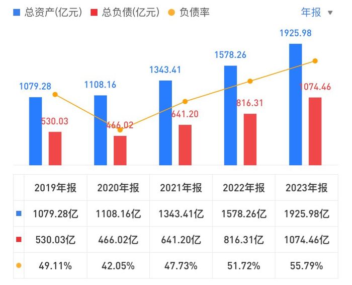 负债方面,2020-2023年,吉利汽车的总负债分别为466.02亿元、641.20亿元、816.31亿元、1074.46亿元。负债率从2020年的42.05%增至2023年的55.79%。
