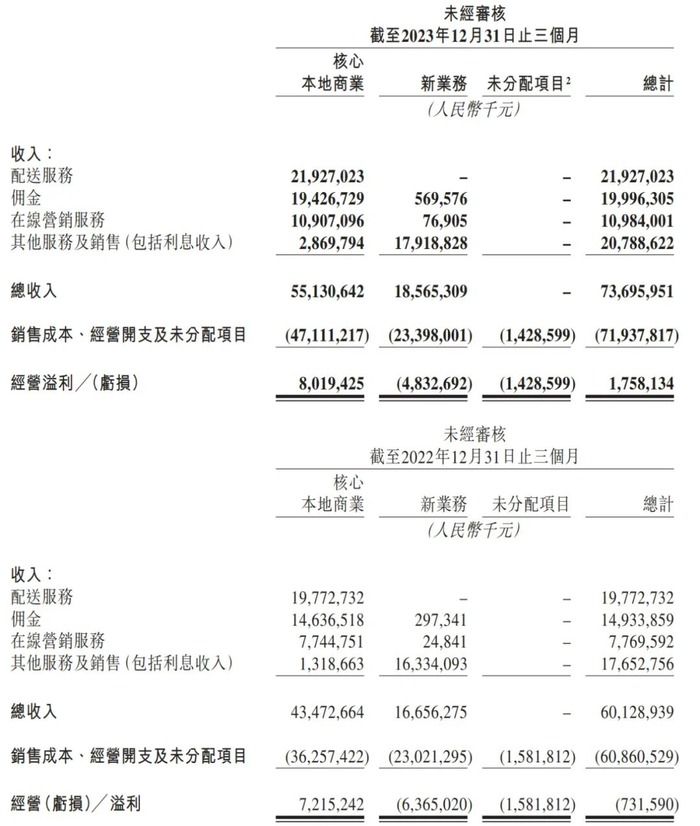 美团2023年第四季度核心本地商业的配送服务及佣金的收入增长主要是由于公司加强供应、产品迭代及消费持续复甦推动核心本地商业分部的交易笔数的增长。在线营销服务的收入增长主要是由于在线营销活跃商家数量及其平均收入增加。
