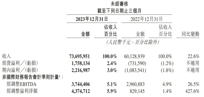 美团2023年第四季度经调整EBITDA为37.44亿元,经调整EBITDA率为5.1%;经调整净利为43.75亿元,较上年同期的8.29亿元增长427.6%。美团2023年第四季度经调整利润率为5.9%。