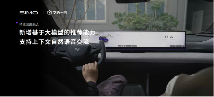 得益于百度AI大模型的底层能力,SIMO实现了与百度文心一言的双向融合,带来更加自然、流畅和更富逻辑思考的人机交互体验。在V1.4.0版本中,SIMO化身为全能管家,新增基于大模型的主动推荐和用车知识自由问答,支持音乐推荐、视频信息问答、景点推荐和查询、功能解答等功能。有问题就问SIMO,自然交流水平更上一层楼,与市面上刻板、机械的语音助手形成了明显的代差。