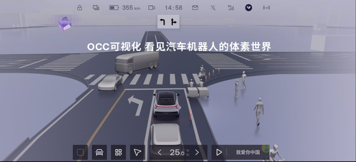 值得一提的是,为了让用户更好地感知OCC技术原理,并能更加安心地使用,V1.4.0版本新增OCC 3D地图彩蛋,用户可以通过车机屏幕清晰地看到汽车机器人眼中的世界。如同积木一样不同颜色的方块标识出车外的障碍物/绿化带/其他车辆等,还有卡通的3D人物标识出过往的行人,给晦涩的AI技术增添了许多乐趣。该功能还支持通过语音开启与关闭,操控十分便捷。