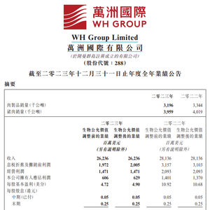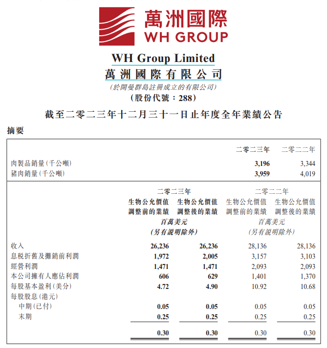 【大河财立方消息】3月26日,万洲国际披露2023年业绩。