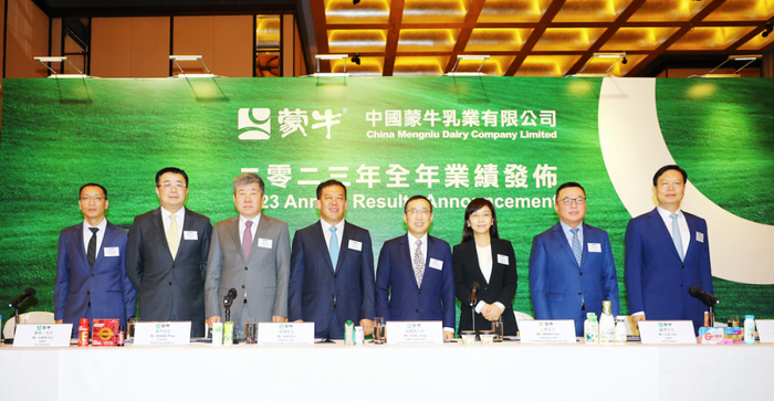 ▲(左四高飞,左五卢敏放)“相信昨天大家看到公司的公告了,也许有点惊讶。”3月27日一早的蒙牛业绩说明会上,卢敏放一开口就切入主题,他强调,这是蒙牛董事会基于战略考虑的一个重要决定,并表态称这次管理层的调整将会有利于蒙牛的整体发展,以及保持战略和运营的稳定,实现高质量发展。解释完了后,卢敏放像往常一样对蒙牛过去一年的业绩做了介绍,随后将话语权交给了刚刚走马上任的高飞,当天两人皆穿了深蓝色西服,站在了业绩会的C位,不过卢系着花色领带,而高戴的是蓝色领带。出人意料的是,高飞的讲话很短,像是没有准备演讲稿般,只有寥寥数句,强调虽然坐在管理岗位上的人变了,但是公司的战略不会变。而蒙牛在极力降低换帅的影响,业绩会后特意选了几张卢敏放和高飞笑着握手的照片进行传播,以显示高层交接顺利完成,但8年老帅突然被换的举措还是吓坏了资本市场。