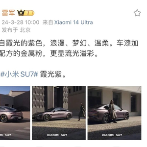 3月28日,小米集团CEO 雷军刚刚在微博上发布了霞光紫SU7的照片。据介绍,车漆加入特殊配方的金属粉,更显流光溢彩。根据此前网友爆料,应该还有小米橙配色的SU7。