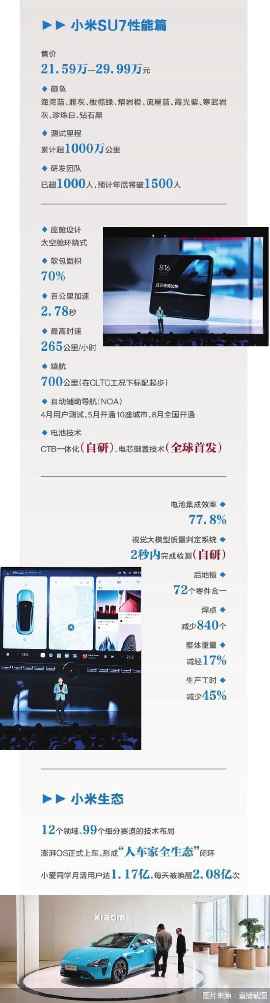 2024年全国两会期间,以新质生产力、数字经济为代表,新经济成为全社会聚焦高质量发展的关键词。三年时间,小米完成首款车落地,这一款车型背后更是新质生产力的体现。在新车正式发布前,小米汽车曾披露过五大核心技术的进展突破,在电驱、电池、大压铸、智能驾驶、智能座舱等关键领域,小米自研技术实现了众多全球第一、中国第一,是小米创业13年技术的积累。在工业硬科技领域,小米自研了CTB一体化电池技术,并全球首发电芯倒置技术,实现了目前CTB电池全球最高的77.8%电池集成效率。此外,小米自研了“9100t超级大压铸集群”和自研压铸合金材料“泰坦合金”,成为全球唯二、国内唯一同时自研大压铸和压铸材料的汽车厂商。