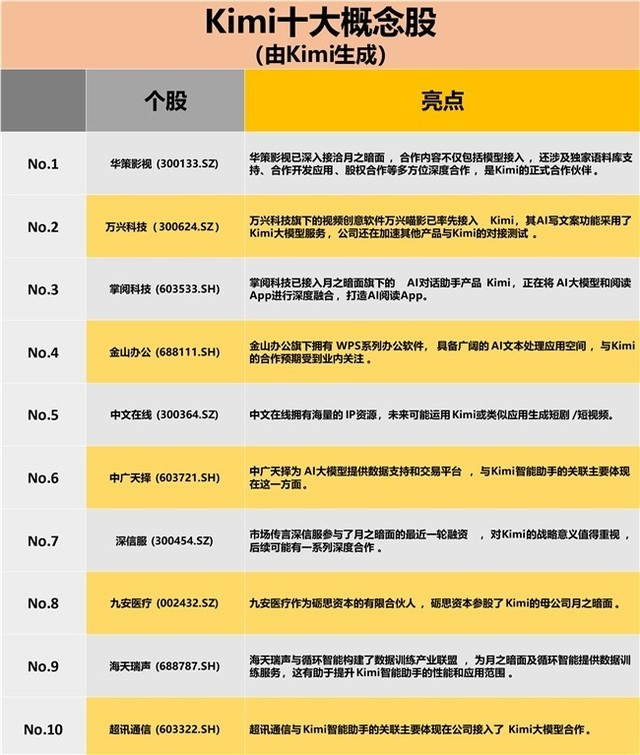 Kimi的火爆更是一度让股市为之震动,不少被视为Kimi概念股的公司接连上涨,AIGC软件A股上市公司万兴科技(300624.SZ),中广天择(603721.SH)、掌阅科技(603533.SH)等公司股价在Kimi爆红期间不同程度上涨。