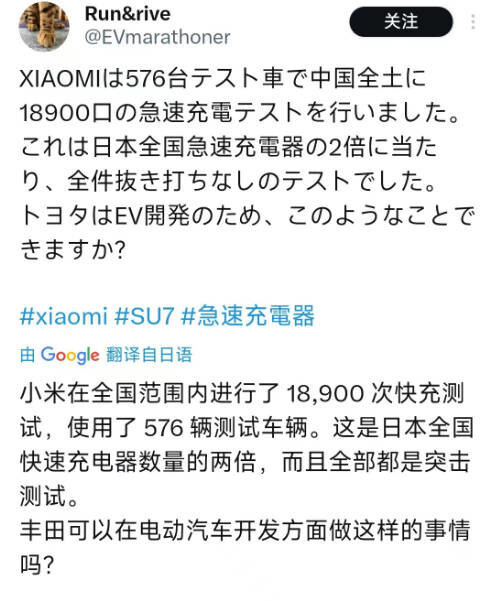 有日本网友反思了日本电动汽车的现状,表示小米在全国范围内进行了18900次快速充电测试,使用了576辆测试车辆,这是日本全国快速充电器的两倍。该网友提问,丰田汽车可以在电动汽车的开发方面做到类似的事情吗?