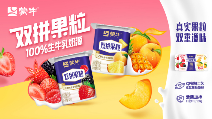 具体到产品层面,蒙牛果粒酸奶是低温酸奶品类正向增长的主要驱动。其中双拼果粒酸奶实现行业首创的“1个产品,2种口味”的产品形式,满足消费者多样化的美味酸奶追求。2023年双拼果粒产品份额增长0.8%,引领品类增长,扩大生意体量。