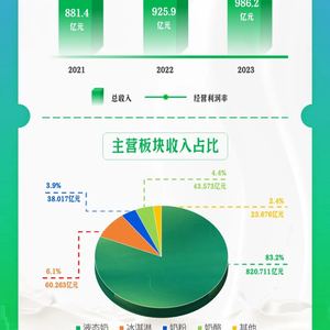 近日,蒙牛乳业(02319.HK)发布了截止2023年12月31日年报。财报显示,蒙牛2023年全年实现营收986.2亿元,同比上升6.5%,利润总额约为61.7亿元,同比增速13.8%。