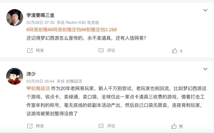 时逢网易新游《射雕》刚刚公测,无处发泄的玩家涌入了《射雕》相关的微博话题中,连带《射雕》一同进行吐槽。