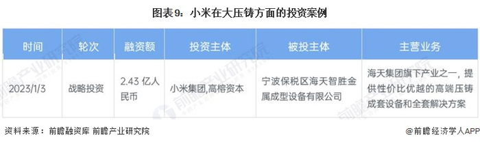 根据发布会内容,小米宣布自主研发了“9100t超级大压铸集群”和压铸合金材料“泰坦合金”,这使得小米成为全球唯二、国内唯一同时自主研发大型压铸设备和压铸材料的汽车制造商。在大型压铸设备的投资方面,小米集团于2023年1月与高榕资本共同投资了宁波保税区海天智胜金属成型设备有限公司,该公司能够生产锁模力180T-8800T的全系列冷室压铸机,并具备年产4000台压铸机的生产能力。