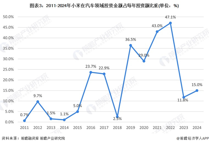 从每年汽车领域投资金额占小米每年全部投资金额的比重来看,2016-2017年和2019-2022年是小米投资汽车领域的两大主要时期,其中在小米宣布启动汽车制造的时间前后,小米相关投资主体在汽车领域的投资金额占比增长到了40%以上的占比区间。