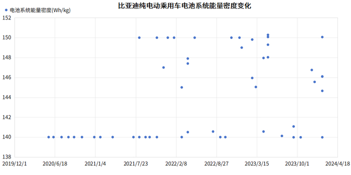 到了2021年8月份,比亚迪申报的搭载刀片电池的新车电池系统能量密度已经达到了150Wh/kg。此后比亚迪的新车电池系统能量密度基本都在140-150Wh/kg之间,并未突破150Wh/kg。