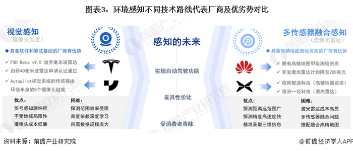 智能汽车的环境感知主要存在以摄像头为主的视觉感知和含激光雷达的多传感器融合感知两种主要技术路线。目前来看,特斯拉是视觉感知方案的坚定支持方,强调“化繁为简”,目前依靠视觉方案的特斯拉仍是将量产辅助驾驶做到最好的公司。而多传感器融合方案被国内众多厂商青睐,纷纷通过开发或投资的方式布局激光雷达和高精地图领域。无论是含有激光雷达的多传感器综合感知方案,还是视觉感知方案,都还属于研发阶段,均存在各自需要克服的困难,最终能以最便宜的价格提供相同功能产品的方案将成为感知的未来。