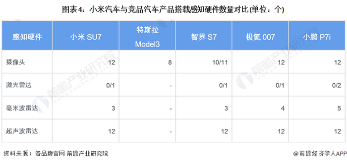 小米SU7在环境感知技术路线上选择了相对保守的含激光雷达的多传感器融合感知方案,与智界S7、极氪007、小鹏P7i等国产品牌选择的感知技术路线一致;相较而言,特斯拉则倾向于依赖深度学习的纯视觉感知,其视觉处理系统具有强大的视觉处理能力,拥有250米最远探测距离,在硬件成本方面具备独特优势。