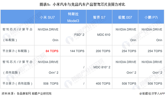 智驾芯片作为自动驾驶系统的“大脑”,对于提升车辆的自动驾驶能力和智能化水平起着至关重要的作用。在智能驾驶芯片及算力方面,小米SU7采用英伟达Orin-X智驾芯片,21.59万元的标配版算力仅有84TOPS,相较于同样搭载英伟达计算平台的极氪007和小鹏P7i而言,算力方面显著欠佳。特斯拉的FSD芯片虽然算力只有144 Tops,但其计算效率大概是GPU的三倍,与两个Orin芯片实际算力相近,同时基于强大的数据积累支撑,其智驾水平毋庸置疑。