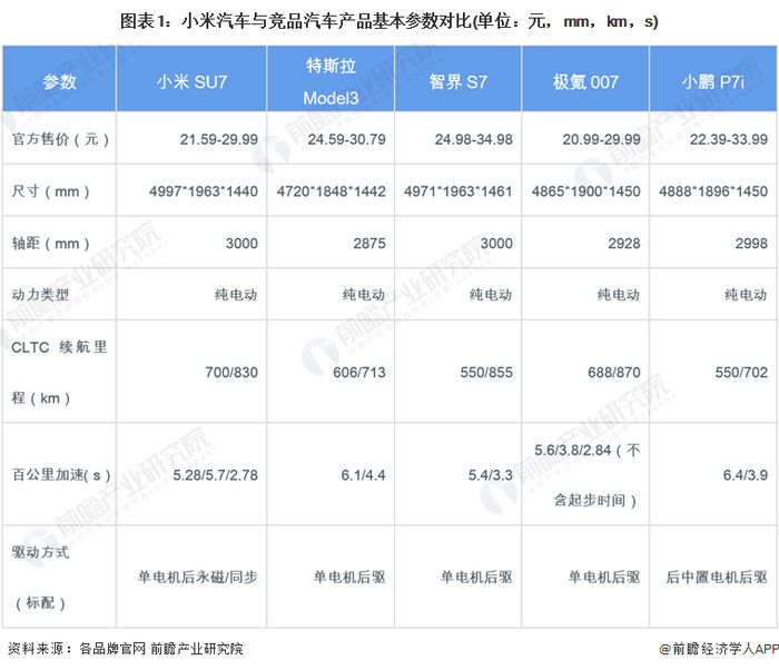 2024年3月28日,小米在汽车发布会上正式公布了其首款量产智能电动汽车——小米SU7,标志着小米集团正式进入智能电动汽车领域,与特斯拉、吉利、小鹏等知名车企展开竞争。特斯拉Model3、智界S7、极氪007、小鹏P7i等车型的产品价格多数在20-30万元间,是小米SU7强有力的竞争对手。